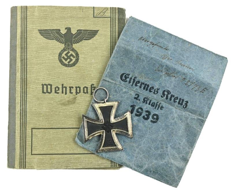In a very nice condition a German Wehrmacht (Heer) Wehrpass on the name of Theodor (Theo) Baum.Theo was a member of the 8. Kompanie (MG) Infanterie Regiment 18 who enlisted in 1939 and saw action in the Polen and France Campaign.After that he wend to the easter front were he was killed in action in 1942.The wehrpass comes with his Iron Cross 2nd Class in the (named) pouch and with deathcard and picture of theo recieving the Iron Cross.A very stunning set!