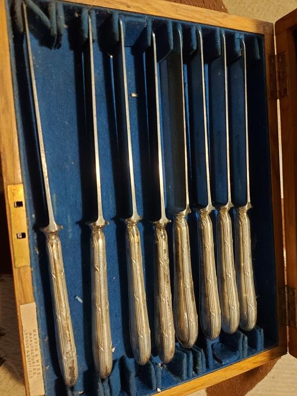 Dinner Knives engraved HJ on handles , not original box, 8 in total by J A Henckles , handles in 800 grade silver. price per knife £15 or the 8 for £95 plus post