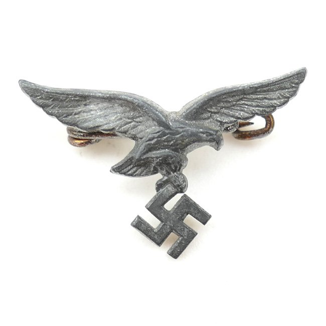 Miniature Luftwaffe Pin, probably a Luftwaffe civil-attire badge or Female issue badge. The 30mm wide zinc type pin is showing a standard Luftwaffe eagle. The pin is not visible maker marked. The pin is complete with functional safety-pin. Nice original miniature eagle in good condition!