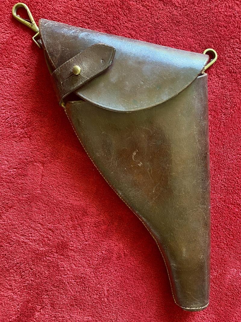 Here on offer is a fine example of an original WW1 British Officers 'private purchase' leather revolver holster with belt loop and two swivel spring hook fittings, probably for the much rarer, Colt New Service Mk I Revolver.Given the quality of this piece, I believe this would have been an officer's 'private purchase' holster and there are no maker's marks or military marks that I can see, which is also normal for private purchased items.The front has the wide flap strap and brass securing nipple.The back retains the wide flat belt loop that is securely stitched in place and looks to have never been used? It has also been fitted with two swivel spring hooks, on short leather straps, that would be used to hang it from a Sam Browne belt, instead of using the belt loop, which some officer's favoured.The leather stitching is all still in place, even around the circular disc at the bottom.The leather is in excellent condition; there is just some slight cracking to the surface finish on the top of the flap and along the front edge of the holster.The brass spring hooks and flap stud now have an aged patina to the finish, which would polish bright if that is your preference.I think it could be used for any of the Webley .455 range or revolvers, even those with a 6' barrel. However, I think it is more likely to have been made to be used with slightly narrower, Colt New Service Mk I revolver. During WW1, the British Army used the Colt New Service revolver, specifically the .455 Eley model, to supplement their standard-issue Webley revolvers. The British military acquired approximately 60,000 of these revolvers from Colt due to increased demand during the war. Therefore, a holster for the Colt is much rarer to find than for the Webley.It measures approximately 13.75' (35cm) from the top corner point of the flap to the tip and weighs 280g.Please see my pictures for the details of the condition, which complement this description.Please see my TERMS OF BUSINESS regarding Deliver Charges and Insurance regarding additional insurance cover, should you require it, BEFORE the item is dispatched.The responsibility lies with the customer to check with your Customs restrictions that this item can be imported into your country.