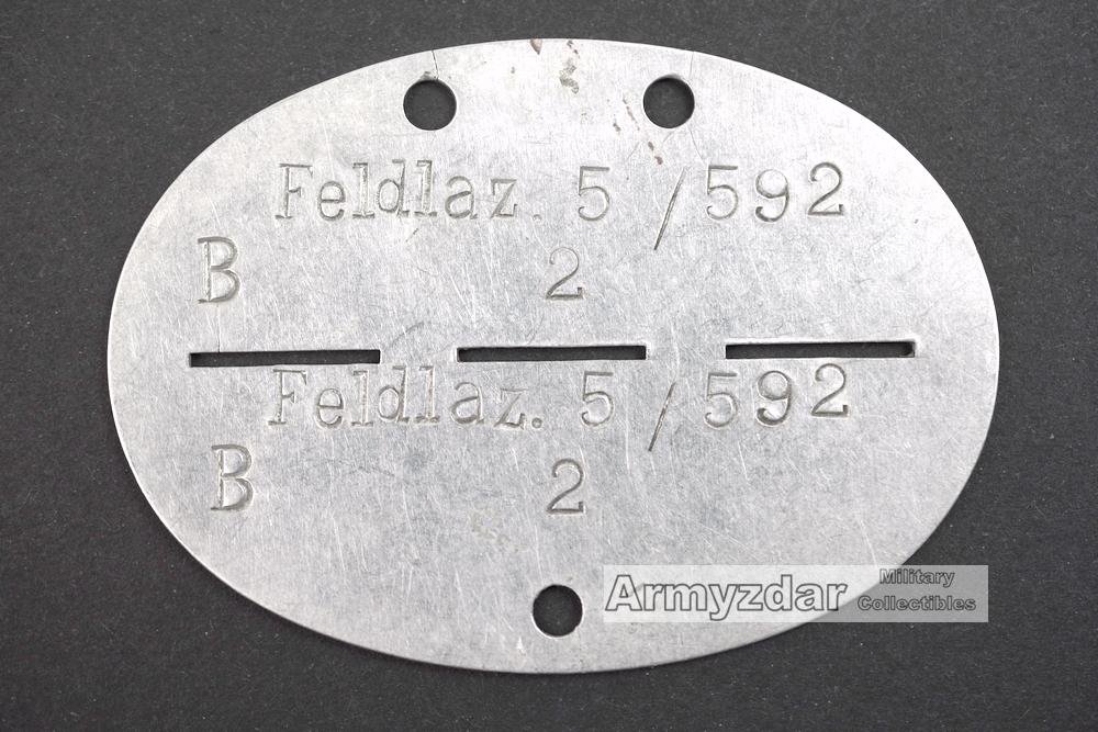 This is a good used relic dog-tag of Wehrmachtu Infantry member.Feldlaz 5/592 = Feld Lazarett 5/592
