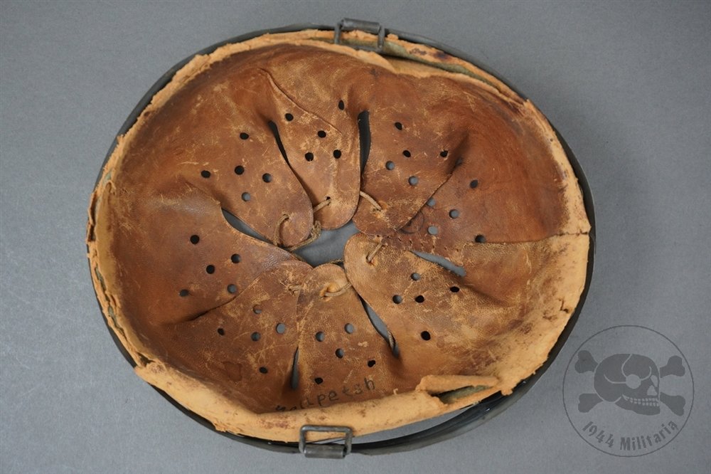 Original German WWII M31 Zinc Helmet Liner Size 66/58 & Dated 1943-This is an authentic, WWII German M31 helmet liner featuring a zinc band, size-stamped 66/58 and dated 1943. The leather is supple and dry and is damaged at the rim of the liner. The leather has worn away or torn from poor storage and the leather becoming very dry (please see photos). The metal band is both maker marked and dated 1943. Still retains the original drawstring.Despite these flaws, it remains a solid original example that would pair well with a helmet in comparable condition. Overall condition: Fair to Good. Sold As Is.