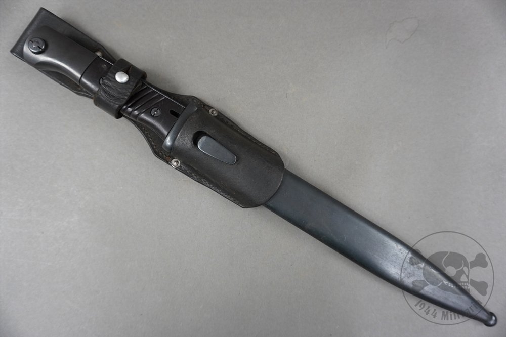 Original German WWII k98 Bayonet Non-Matching With Pre/Early War Leather Frog-This bayonet is in excellent overall condition, showcasing its original craftsmanship.Blade: Retains its original bluing with only light aging. Maker marked '43 fnj' by Alexander Coppel GmbH (aka Alcoso), of Solingen. Also has the serial number 5422 on the other side.Grips: Bakelite grips are intact, free of cracks or damage. Minor wear. Also has double Waffenamt (WaA) markings.Locking Button: Fully functional and operates smoothly.Scabbard: Unmarked and shows light aging, remaining in very good condition.Included with the bayonet is a unmarked pre/early war leather frog featuring aluminum fittings. The leather remains in excellent condition and complements the bayonet well.This set, consisting of the bayonet, scabbard, and frog, is a prime example of a collectible WWII German K98 bayonet ensemble in excellent condition.