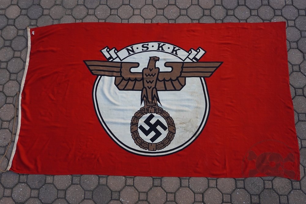 Rare Original Third Reich NSKK Flag 150 x 250 With RZM Tag-This is an original Third Reich NSKK (Nationalsozialistisches Kraftfahrkorps / National Socialist Motor Corps) flag, measuring approximately 150 x 250 cm (59' x 98').The flag features the NSKK eagle emblem printed on a white roundel set against a red field. The bronze colored eagle, with outstretched wings, clutches a wreath enclosing a black swastika, and above it is a white banner inscribed 'N.S.K.K.'. The design is screen-printed on wool cotton construction.The bunting edge retains its original rope, and the flag is marked with its RZM (Reichszeugmeisterei) paper tag, verifying official NSKK issue. The fabric shows some light staining on the white roundel and with very minor wear consistent with age, but remains in excellent overall condition, with strong colors and no major damage. In one corner of the flag it appears to be a period written size of the flag in ink '150/250' and is most likely done at the factory.This is the first time we are offering this rare NSKK flag, presenting a unique opportunity to acquire a large format organizational flag with impressive display presence and highly desirable markings. Flags of this size from the NSKK are far less common than other Third Reich party or paramilitary flags, making this an exceptionally scarce find.