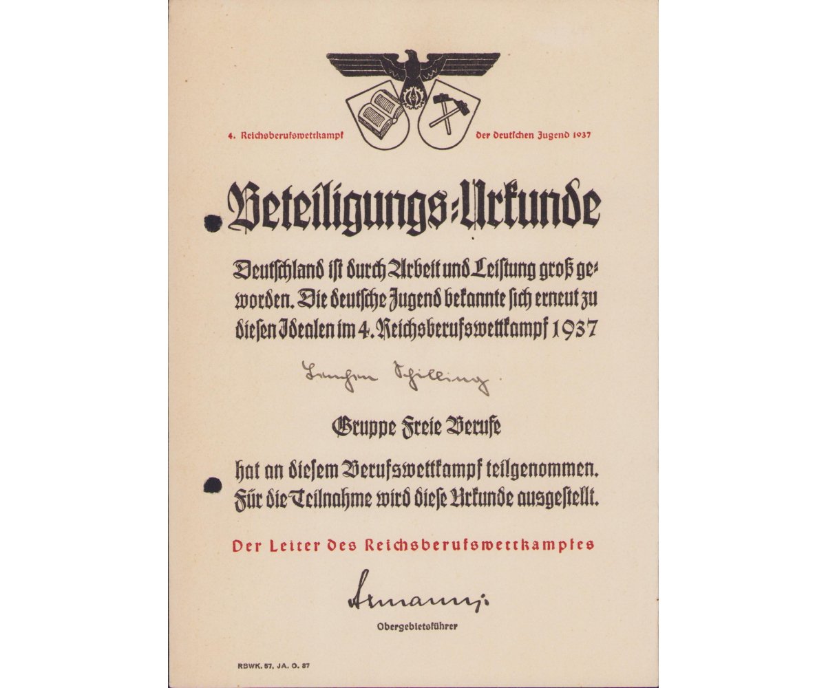 Reichsberufswettkampf der DJ 1937 Certificate