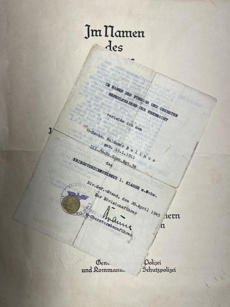 'Waffen-SS' citation set of 'SS-OberscharfĂŒhrer' Waldemar Ballnus who served within the 'Schutzpolizei' and finally within Pz.Gren.Rgt.38 of the 17.SS-Pz.Gren.Div.'Götz von Berlichingen'1) A4 size promotion document to 'Oberwachtmeister der Schutzpolizei' which bears the stamped signature (most probably) of 'Generalmajor der Polizei' and 'Kommandeur der Schutzpolizei' ?2) KvK I Kl. citation which has issued because of his heroic action on 3-4-1945.Ballnus participated in fightings at the 'Ostfront' and 'Invasionsfront'!!Never seen before a citation which has been signed by all three divisional ,regimental and battalion commanders!!The 'divisional' commander is most probably Josef BĂ€urle (DKiG 20-1-1943)Although the citation has been in 4 parts (and has been professionally restored with acid free restoration tape) a great and rare signed citation!!