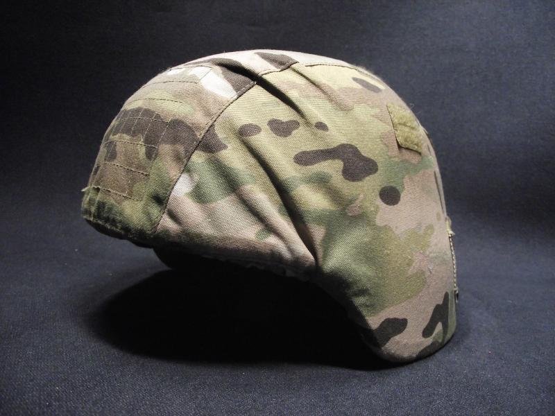 Nice TBH-II by Gentex with MTP cover with counter weight and battery pocket on the back. I have not taken the cover off but from what i can see the outside finish is the usual rough green factory issue. Inside has its full padding, Gentex M-8 mold stamp to the inside crown, and its complete chinstrap assembly. Side has its clear data label, owner has initialed the ''warning'' label to the other side.