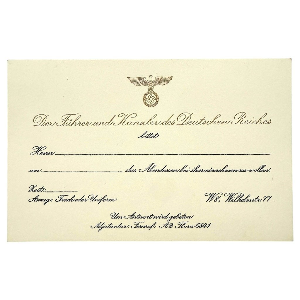 This German Adolf Hitler invitation card is in mint condition and was used to invite someone to dinner at Wilhelmstrasse 77 at the Reich Chancellery in Berlin.A unique item for your militaria or World War II collection!Article number: 16350Originele WWII Duitse Adolf Hitler uitnodigingskaartDeze Duitse Adolf Hitler uitnodigingskaart is in mint conditie en door middel van deze kaart nodigde uit een persoon uit voor het avondeten aan de Wilhelmstrasse 77 aan de Reichskanzlei in Berlijn.Een uniek item voor de militaria of Tweede Wereldoorlog collectie!