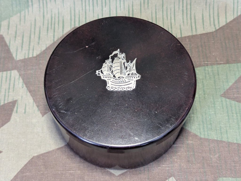 Original Kaffee HAG Bakelite coffee container with a metal inlay ship on the lid. This one is in good condition with minor wear. No cracks. This is actually a very good container for storing coffee, it has a very tight seal, even though it is just a slip fit. Just a very nice functional Bakelite container. A great thing to keep and use to bring a little history into your day to day life.
