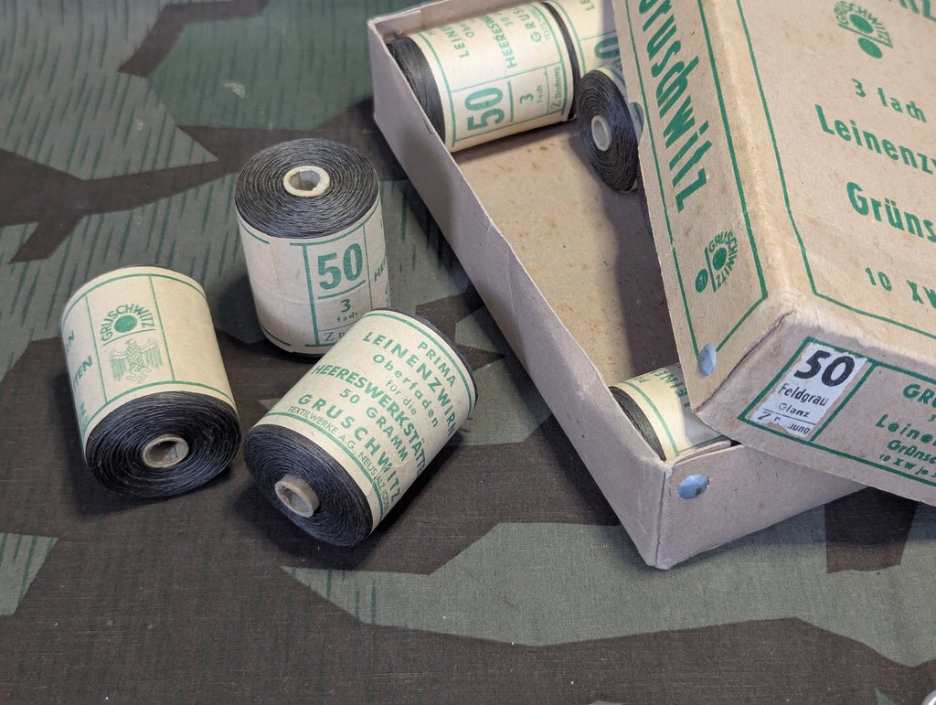 Original Wehrmacht HeereswerkstÀtten Feldgrau linen thread spool.This came from an army work shop so it would have been used by the German army itself not simply by companies making stuff for the army. It would have been used for repairs, modifications, and unit manufactured items.Price is for one spool.These are generally in good condition, some labels may have some minor damage, like a small tear from storage or a loose thread. Very nice example.The empty box the thread came in is available separately.