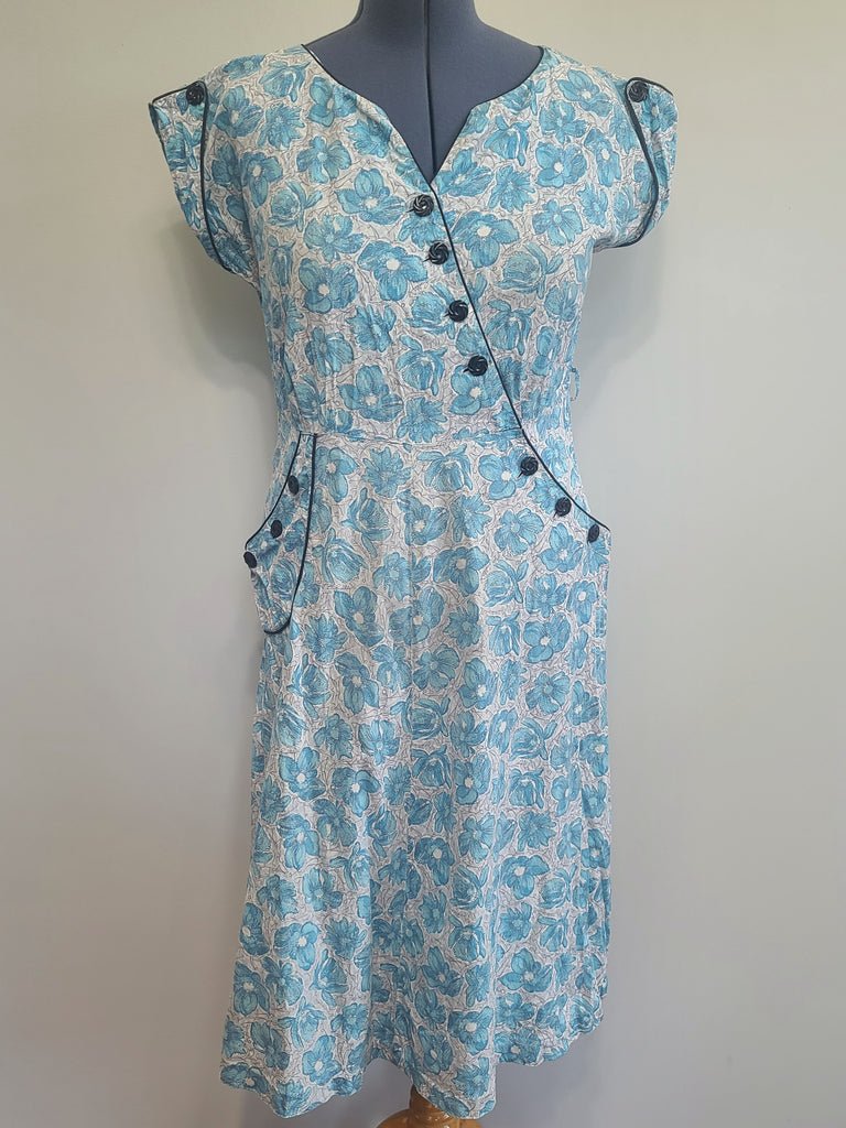 Vintage 1940s blue and white flower print dress.MEASUREMENTS (approximate):Bust- 41'Waist- 36'Hips- 43'Length- 44'Fun asymmetrical button design. One pocket on the side. Faded label in the neck. There is some repairs and general wear. There are repairs on the sleeves and under the arms. The bottom hem material is a little stiff. Missing belt.