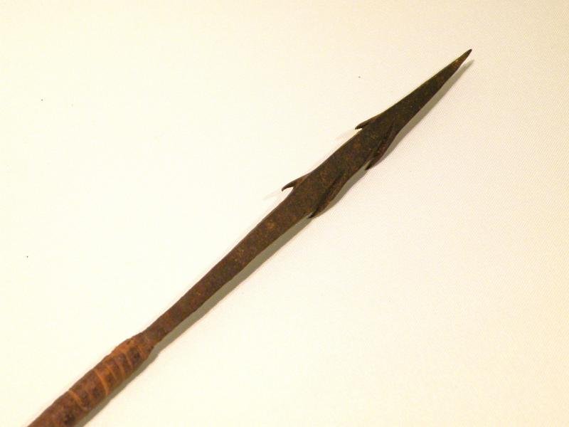 Hand wrought iron arrow from the Oceania region with four barbs. This is attached to a bamboo cane shaft with very fine leather binding. No flight feathers but it is notched at the bottom which is also bound to stop the cane from splitting. In good condition and it measures 24.5 inches long.Ship to UK mainland only. Proof of age required on purchase.