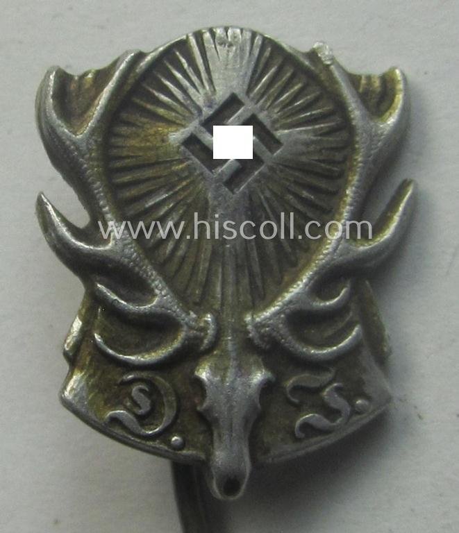 This is an attractive - and not that often seen! - membership lapel-pin (ie. 'Mitgliedsabzeichen') that signified membership within the: 'Reichsbund Deutsche Jägerschaft' (ie. 'DJV') being a very detailed- and as more often non-maker-marked example that is executed in typical silverish-coloured, aluminium and that comes in an overall nice- (and I deem only moderately used- ie. worn-), condition. The lapel-pin shows the 'DJV'-logo as mounted on a swastika-sign - and has I deem never been cleaned nor polished and still retains a truly nice and only slightly darkened- ie. tarnished, age-patina. This example comes mounted onto its long-sized pin: it is not maker-marked but does show a 'Ges.Gesch.'-designation. I deem this is a most certainly decorative badge which I have priced according to its nicely preserved condition!