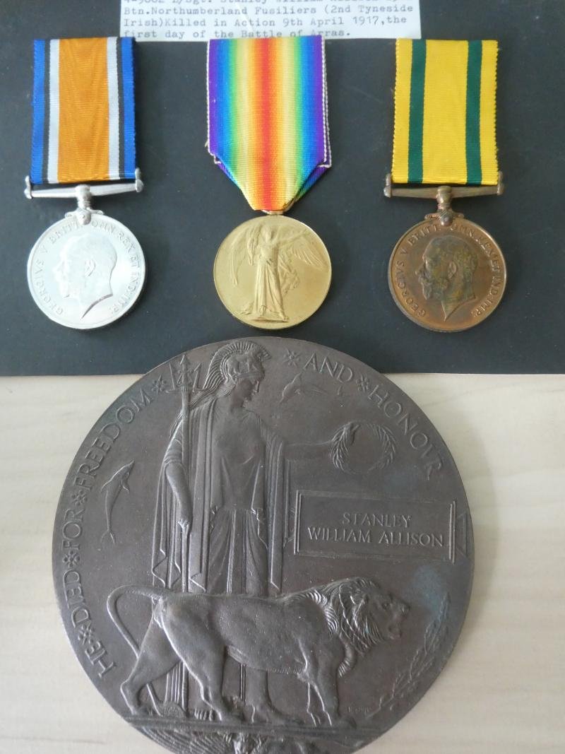 SCARCE CASUALTY TERRITORIAL FORCE WAR MEDAL AND PLAQUE GROUP TO ALLISON -25TH (TYNESIDE IRISH) BN NORTHUMBERLAND FUSILIERS-KILLED IN ACTION ON 9TH APRIL 1917-FIRST DAY OF BATTLE OF ARRAS