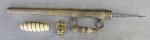 Original period manufacture. A complete example consisting of blade with locking tab, scabbard, grip, crossguard and pommel. WKC marked blade with standard etching on the surface, and evidence of old cleaned corrosion. Grip surface has some issues as shown, the tang slot on the crossguard will need some filing to fit. No idea if all of the parts are of WKC manufacture.