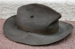 Original period manufacture. Scarce example of a campaign hat introduced during the era of Cuban Occupation and the Philippine Insurrection. Tan wool felt hat with a triple stitch edging to the brim edge. Brass screen ventilators, one on each side of the crown, wide brown leather sweatband with a corrugated spacer band between the body of the hat and the sweatband. The brown silk hat ribbon is intact, scattered mothing as shown.