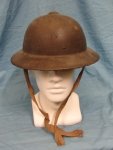 Original era manufacture. A British pattern helmet in molded paper with a dark olive brown exterior. Rudimentary woven paper liner and chinstrap, with a paper tag with numerous kanji handwritten on its surface.Very sound, normal age and wear.