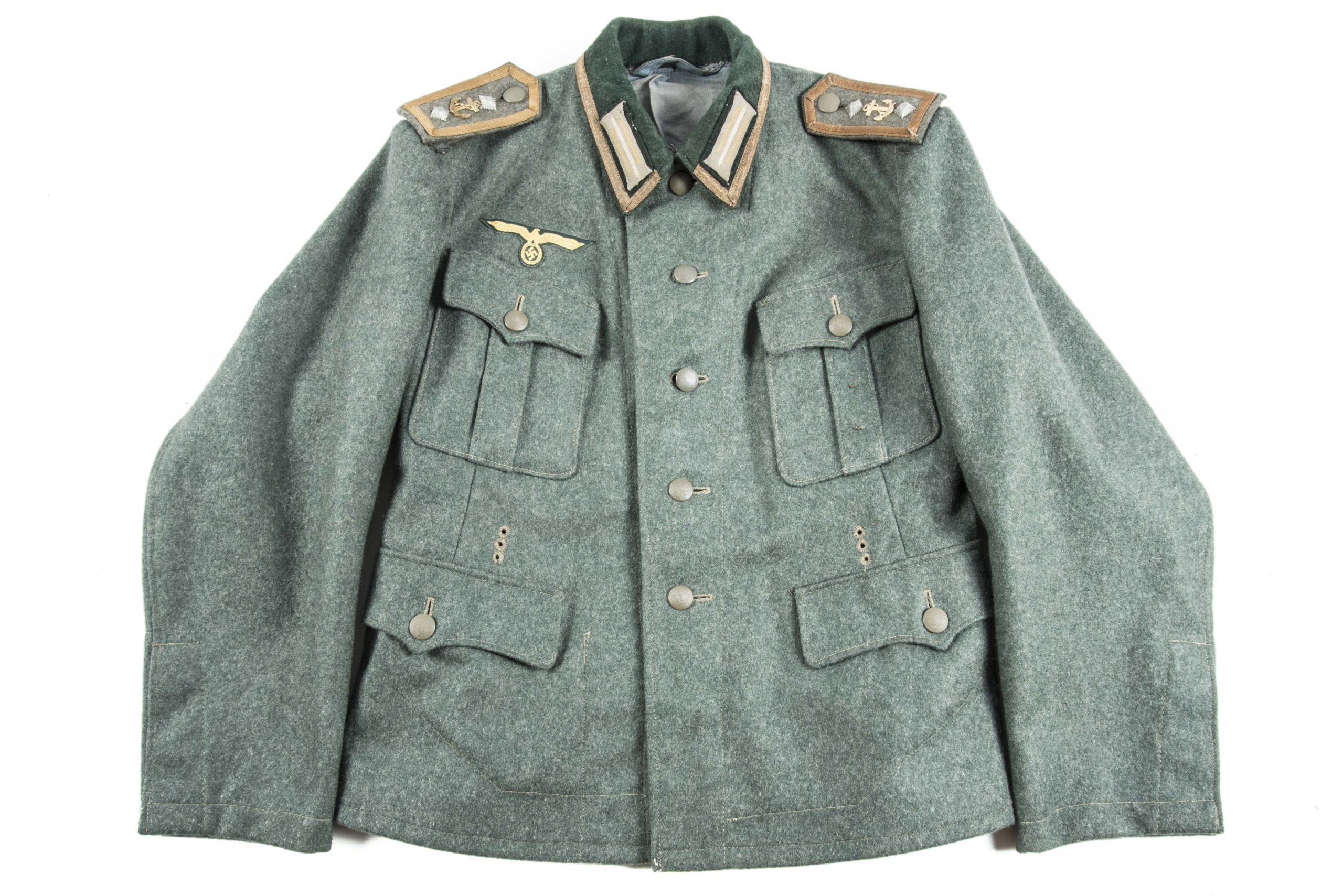 Rare Dutch made NCO Küstenartillerie field blouse marked A40 in excellent condition. This is a nice untouched example of a M40 field blouse which was modified by adding a bottle green collar and the deletion of the lower pockets. The garment retains its wartime sewn insignia for a Oberfeldwebel der Küstartillerie. The garment is in very good only lightly worn condition and would be very hard to upgrade!