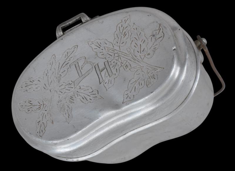 German standard issue aluminium M31 messtin which has been decorated to the lid in a floral design incorporating the soldiers initials of 'BH'.Maker marked & dated 'FWBN37' to lid with mostly illegible through wear maker to side of body . Wire handle intact.