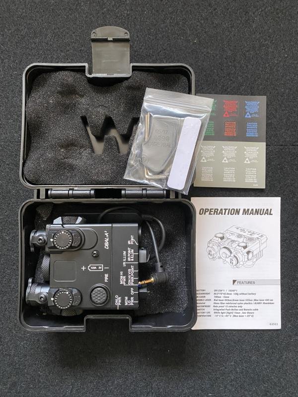 This is a very nice an un-used WADSN DBAL-A2 Illuminator / Laser Module Blue + IR Laser which this fully functional replica of the DBAL-A2 module incorporates a high-performance flashlight that offers an optimal light output of up to 160 lumens (with continuous and strobe modes). It also features a blue laser designator. Moreover, the device's laser emitters are vertically and horizontally adjustable. The item uses a 1 x CR123 battery and includes numerous illumination modes that are easily customized (both laser and flashlight). DBAL-A2 is machined from high-quality aluminium alloy, significantly improving the replica's overall look and versatility in low-light conditions. The item is compatible with a standard Picatinny rail interface system. The product also includes a remote switch with a 2.5 mm pin that fits laser indicators manufactured by WADSN.Check out our YouTube channel below.https://m.youtube.com/results?sp=mAEA&search_query=chase+militaria+