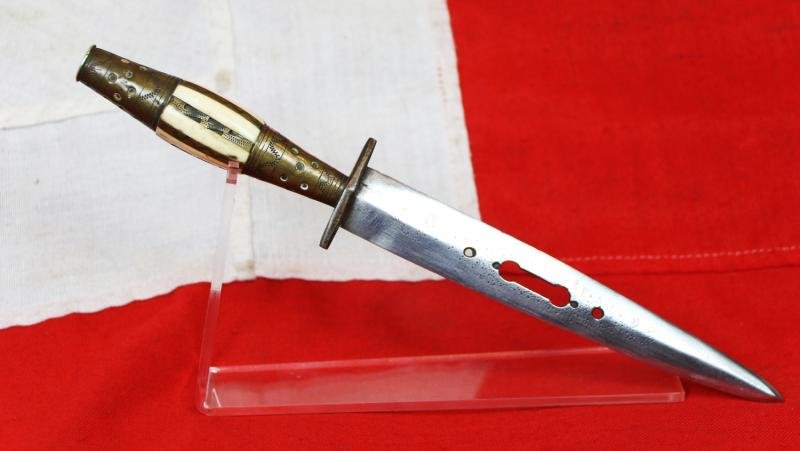Although frequently termed the plug bayonet knife, they were not actually used as bayonets as such, but, once the term was used it has remained in common parlance, even today.A 19th Century Spanish Fighting knife; Albacete Spain; This knife measures 10.75 inches in length with a ornate double edged 6.75 inch blade. The blade has four pierced hole added for traditional decoration as well as pin point punch engraving decoration. The hilt is brass with carved bone. The bone has been fluted length ways and filled with decorative brass panels.The term 'Albacete plug bayonet' likely refers to the historical use of knives from Albacete, Spain, as the earliest form of plug bayonets. These daggers were inserted directly into a musket's barrel, creating a pike-like weapon but preventing the firearm from being used for shooting. While the specific term 'Albacete plug bayonet knife' isn't a historical designation, it highlights the Spanish city's renowned knife-making tradition in the 16th and 17th centuries, which produced the raw materials for these early military bayonet