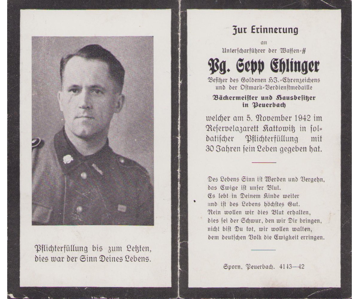 Death notice of Sepp Ehlinger who died on the 5th of November 1942 in the Polish area of Katowice.