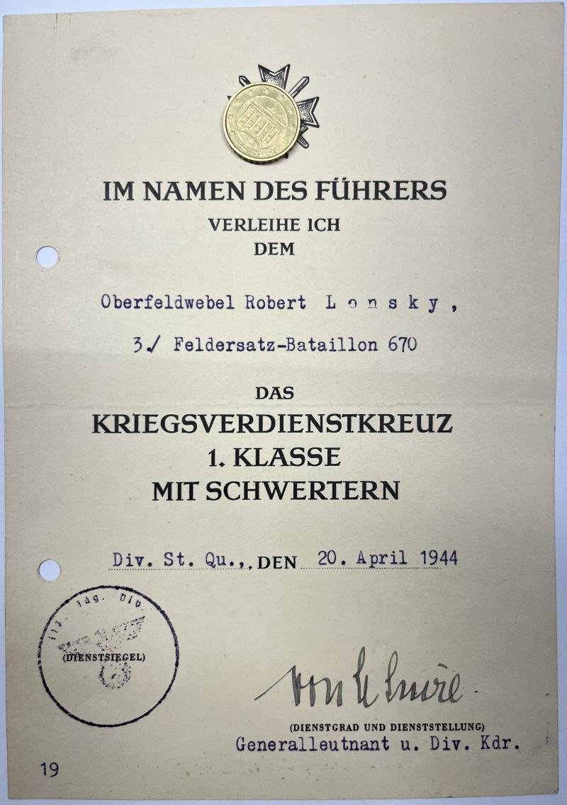 KvK I Kl. citation of 'Oberfeldwebel' Robert Lonsky who served within Feldersatz-Btl.670 under command of the 117.Jäger Div.The cotation has been signed by 'Generalleutnant' and divisional commander ,Karl von le Suire (DKiG 25-4-1942 ,RK 26-11-1944)