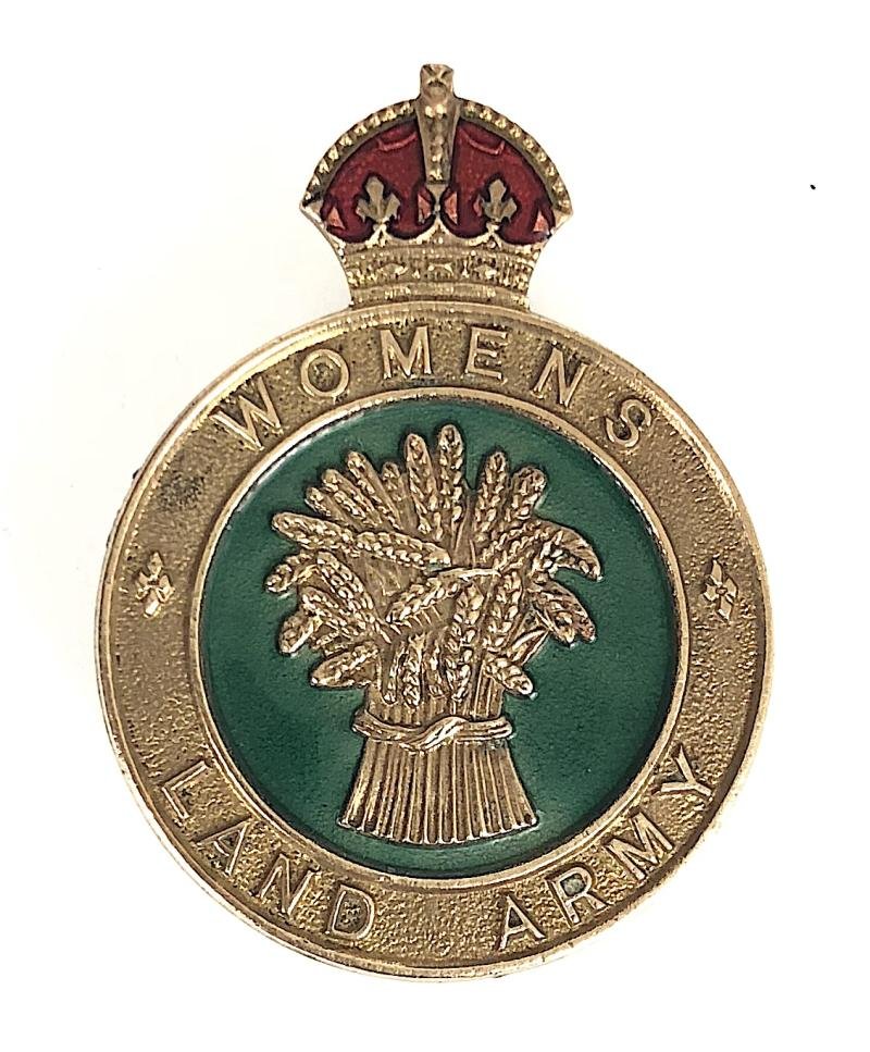 A fine quality scarce original Second World War period 'Womens Land Army pin badge', gilt brass example inlaid with green enamel to central wheatsheaf and red enamel to the Crown, the reverse impressed with scarce maker's details 'Marples & Beasley Birmingham'. Very good used condition, complete wth original pin fittings, no defects to the enamel.Height approx 35mm.Worn on the felt hat and also on the uniform green jumper, discontinued after 1942 due to the metal shortage.