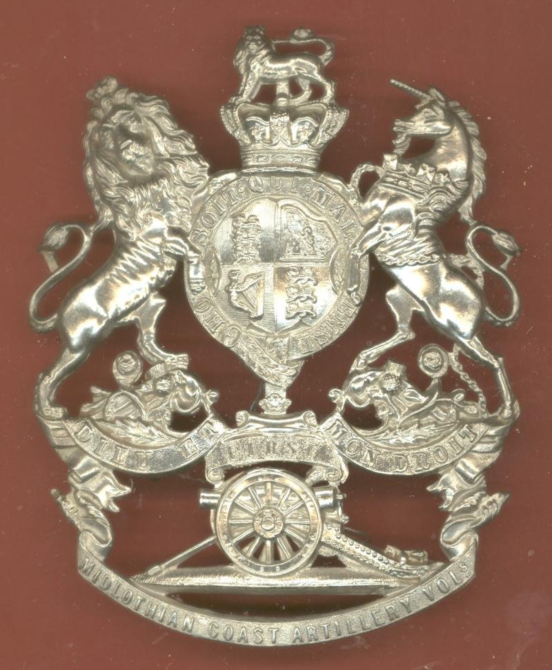 A fine scarce die-stamped white metal example worn circa 1878-1900. Royal Arms with scroll below inscribed 'FIRST' over a gun resting on a scroll inscribed 'Midlothian Coast Artillery Vols'. Three loops to reverse. VGC
