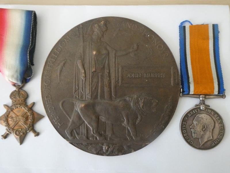 1914/15 Star and British War Medal.named to:14444 PTE.J.MURPHY.R.IR.FUS.Bronze Memorial Plaque, named to:JOHN MURPHY.Plaque and Medals about good very fine, medals with silk ribbons.14444 Private John Murphy 9th Bn.,Royal Irish Fusiliers died of wounds on 18th May,1917.He was born at Milford,County Armagh and enlisted in Armagh. He is buried at Bailleul Communal Cemetery Extension, Nord.