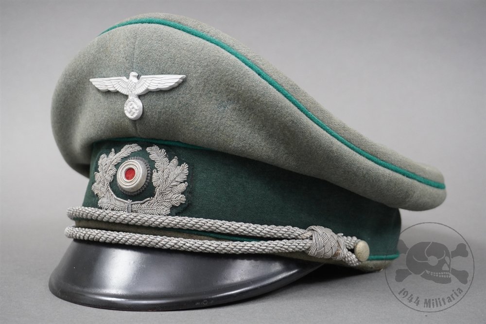 Original German WWII Heer Officer's Gebirgsjäger Visor Cap Size 57This is an authentic 'service used' Heer officer's visor cap constructed of fine fieldgray wool with a dark green band. The cap features the classic high peak profile, with green piping along the crown and flanking either side of the band, denoting service in the Gebirgsjäger (Mountain Troop) branch.The exterior wool remains in good condition, showing some staining and minor mothing. Both the eagle insignia and the wreath with cockade retain sharp details, and the silver bullion chin cord remains intact. The chin cord shows some aging and discoloration. The black lacquered visor is intact and shows hardly any cracking and marks.The inside of the cap shows more use and damage -- the satin lining and partial celluloid diamond are in place and show quite a bit of staining and separation. While there is no maker mark, there is a marketing slogan 'Sonder-Klasse'. The size stamp is no longer visible, but the cap measured to be approximately a size 57. The leather sweatband shows some damage and discoloration.Overall, this visor cap is still a nicely preserved example, retaining its original character and displaying some signs of age and use—a nice piece for any advanced WWII collection.