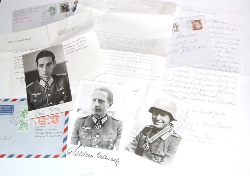 Three signed photographs of Knights Cross holders, each with a signed letter of provenance. 1) is a photograph of Hans Roeger, an unteroffizier and platoon leader in Grossdeutschland Panzer Fusilier Regiment, awarded the KC in September 1944. 2) is Burghardt von Saldern-Wilsnack, an oberstleutnant and commander of Motorised Grenadier Regiment 51, awarded his KC in November 1943, and 3) features Klaus Gollnick, a hauptmann in Fusilier Battalion 371, injured in August 1944 in Poland and awarded the KC in October of the same year. The photographs, letters of provenance and envelopes were part of the collection of Col. Edward D. Marino of Sharpsville USA, an army Vietnam veteran and historical document collector who died in 2018, aged 77.