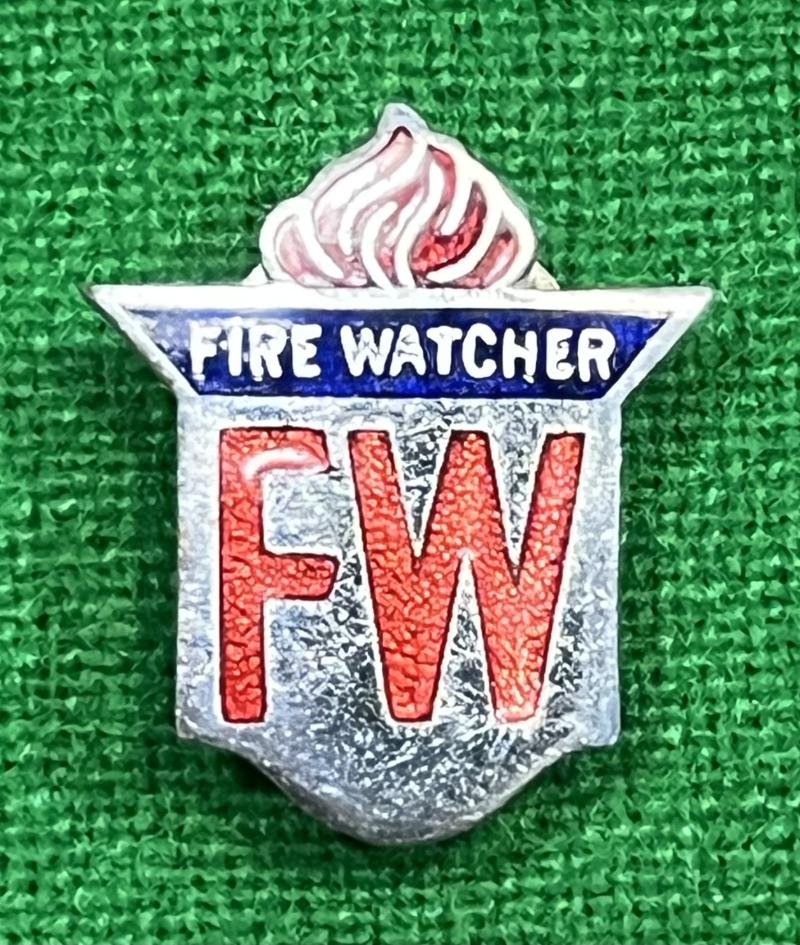 Chrome and enamel, lapel badge for a Fire Watcher. Badge worn by the force intended to stop the spread of fire caused by bombs in mainly industrial/business premises. Superceded in 1941 by the Fire Guard. Badge in good, bright condition.
