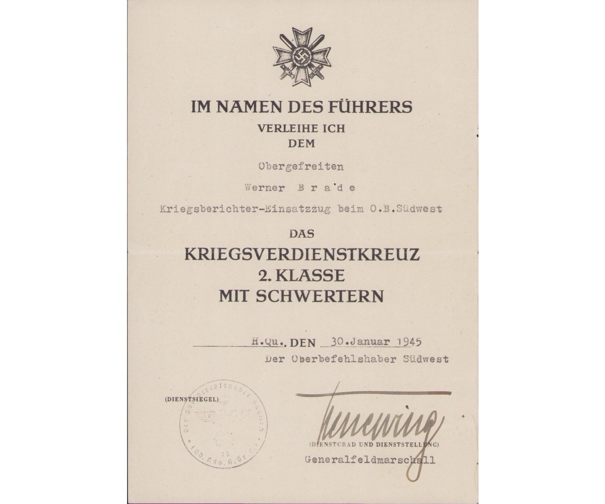 Very nice Wehrmacht Kriegsberichter related Kriegsverdienstkreuz award document in used, but good condition.