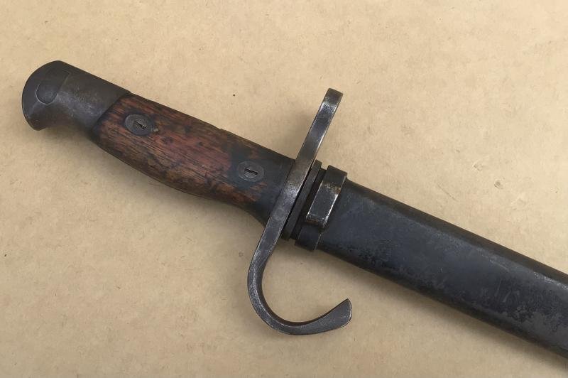 Bright steel blade. Some corrosion to the ricasso area but may actually be a poor casting of the steel. Maker marked Mukden Arsenal, Manchuria. Original wooden grips and working locking stud. Comes with all steel scabbard.