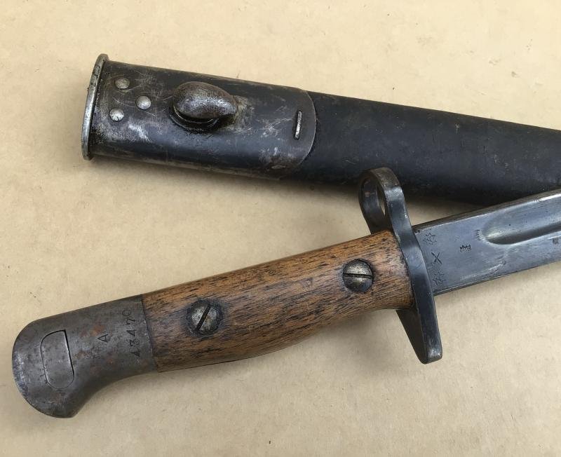 A rare nice example dated 1919. Original wooden grips and working locking stud. The ricasso stamped with Lithgow Stars and dated 1919 with' Lithgow'. All bluing remaining. Comes with British made tear drop scabbar