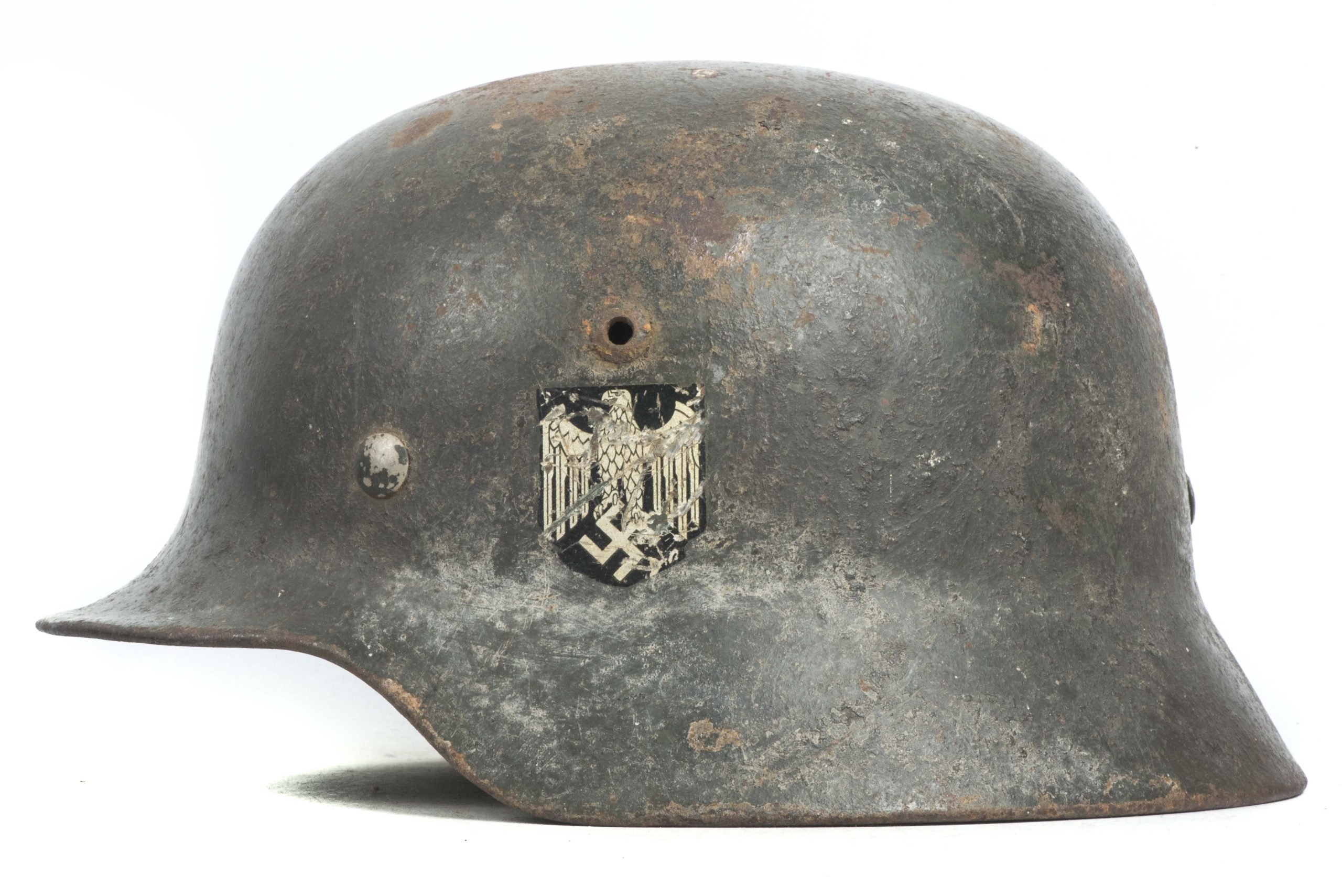 Combat used M35 Heer double decal helmet marked SE62 indicating production by Sachsichse Emaillierwerke. The helmet retains its factory installed non reinforced liner which has the typical damage near the swivel. The helmet was produced with two decals. The helmet is externally camouflaged in a textured Feldgrau paint, carefully painting around the Heer decal. The Tricolor decal can be seen peaking trough the paint. Nice combat used helmet, untouched.