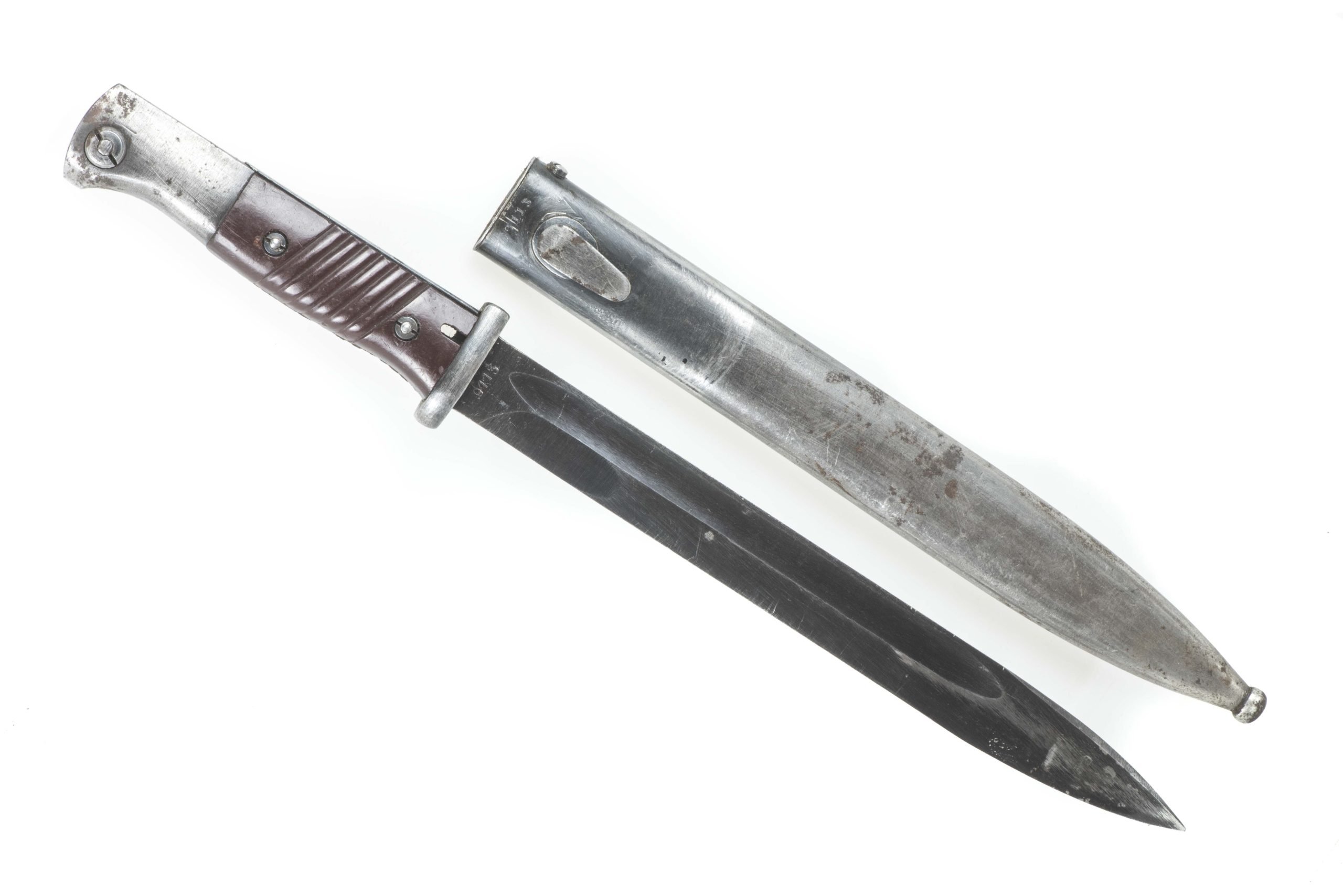 Matching K98 bayonet marked 43 cqh indicating production byClemen und Jung,Solingen. Nice example in good used condition with original factory finish and has never been sharpened.Unfortunately I can not offer shipping outside of mainland europe for edged weapons.