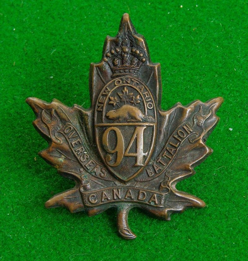 WW I bronzed cap badge with two loops and makers details for Maybee's to the reverse worn by the 94th. {Port Arthur} Infantry Battalion C.E.F. A maple leaf bearing the king's crown. a beaver within the arched title, ' New Ontario ' the number, '94' and ' Overseas Battalion ' ' Canada ' scrolls.
