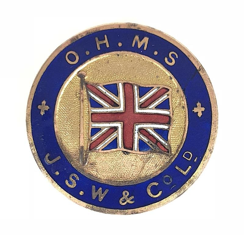 A scarce original First World War period 'On His Majesty's Service J. Samuel White & Co Ltd war workers identification badge', large gilt circular example bearing blue enamel title surround 'O.H.M.S' 'J.S.W &.Co Ld' with patriotic red, white and blue enamel Union Jack Flag to centre; the reverse impressed with maker's details 'R.NEAL PERSIVAL St. LONDON E.C.' and official issue number '2172'. Very good condition, complete with original buttonhole fitting, no damage to the enamel, gilt finish remains bright.Diameter approx 31mm.'J. Samuel White & Co Ltd Shipbuilders & Engineers' East Cowes, Isle of Wight.