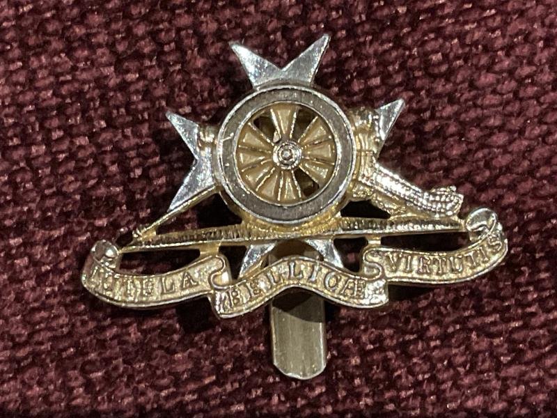 Mint condition silver and gold colour A/A post 1974 Royal Malta Artillery anodised small beret badge on rear slider.