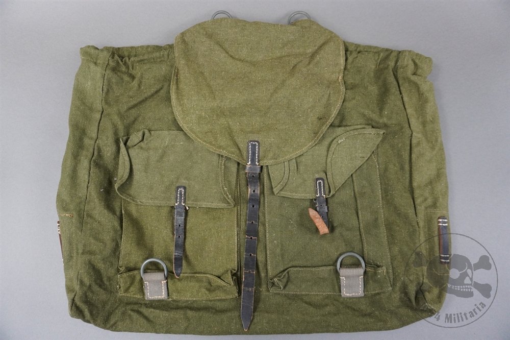 Unissued Original German WWII Heer/Waffen SS Rucksack-This is an authentic wartime rucksack as carried by German Army (Heer) and Waffen SS troops during WWII. Constructed of durable field-green canvas with reinforced stitching, it retains all of its original leather and metal fittings. The pack features two front accessory pockets, leather strap closures, and steel D-rings for securing an A-Frame and additional field gear. The drawstring inner closure remains intact, along with the full internal divider pouch.Although unmarked, this rucksack is a genuine period example and remains in unissued condition, showing only age-related storage wear. The leather components are complete but exhibit some dryness and light surface cracking, typical for untouched examples. All stitching is strong, and the metal hardware retains its original wartime finish.An excellent and very well-preserved field pack that would have been standard issue to infantry and combat troops. Perfect for a WWII Heer or Waffen SS display or collection.