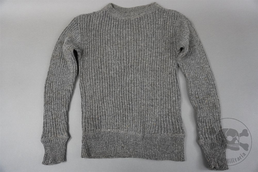 Original German WWII Wehrmacht Issue Late-War Gray Wool Sweater Size 1-This is a superb example of a late-war standard issue German wool sweater, a scarcer period-manufactured piece issued to Wehrmacht and Waffen SS soldiers. Constructed from mixed light-to-dark gray wool, the sweater retains excellent condition with no repairs, stains, or tears, but a few very small moth holes are present.The size label is intact along the back of the neck, faintly marked '1', while the maker's label remains sewn to the lower waist area. Though the bottom tag is now faint and the RB-number is no longer legible, it would have originally carried the Reichsbetriebsnummer designation.Scarce and desirable, this piece would display beautifully under a tunic, greatcoat, or winter parka, an outstanding example of late-war German clothing issue in excellent condition.