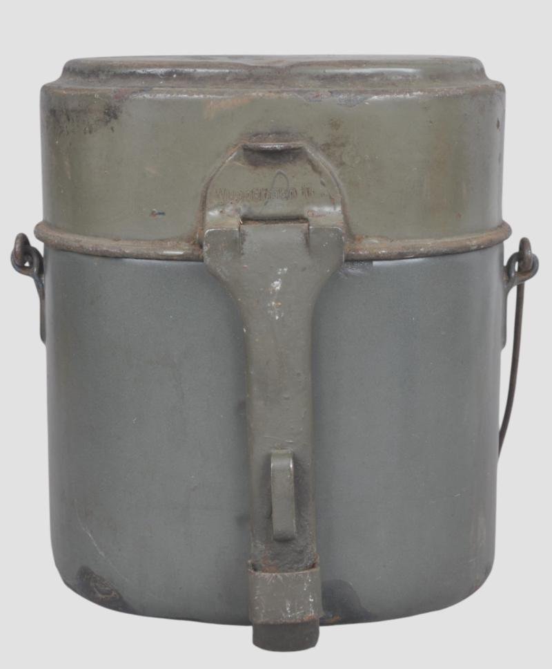 WW1 German green enamelled messtin both top & bottom dated 1917 .Remaining in good condition these were a later war ossie the earlier examples being in tin & zinc. Wupperman 1917 maker mark & date to lid , Silesia 1917 to body.
