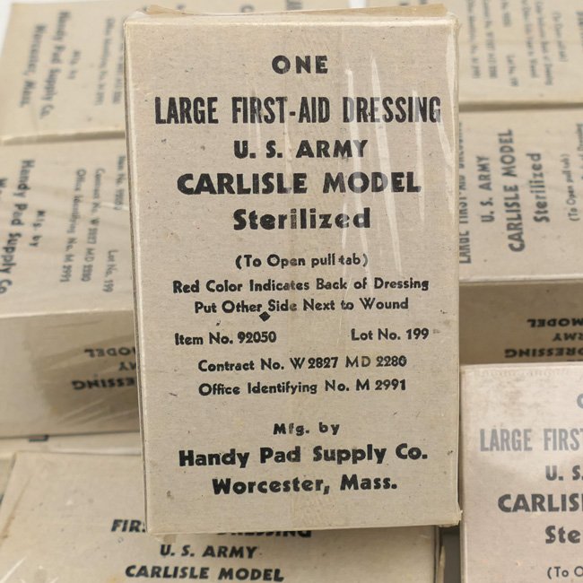 Large US Army First-Aid Dressing (Carlisle model). The full unissued package is nicely maker marked by the company of 'Handy Pad Supply Co.' from Worcester, Mass. These were intended for the medic bags. The price is naturally for one package in good unissued condition!