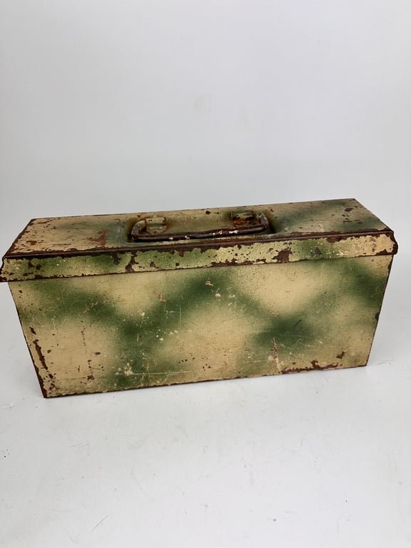 Two-tone camouflage MG34/42 ammo box.'FJR6' The handle has some damage but fully operational. Real Nice camo and hard to find like this. Combat used condition.