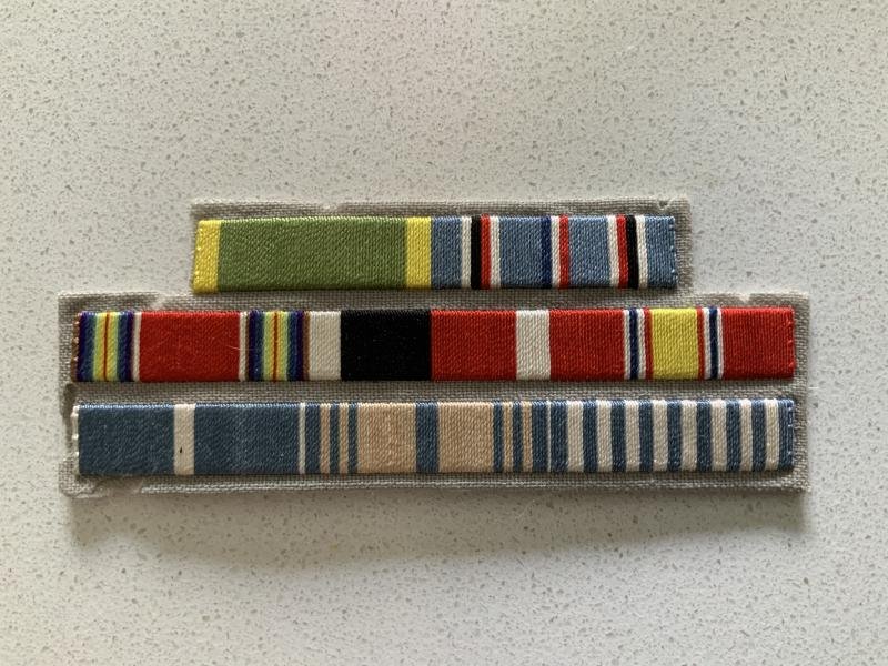 A WAC 8 medal ribbon rack, machine embroidered in silk thread. Spanning WWII to Korea.Top left to right WAC Service - Good C/onductMiddle WWII Victory - Occupation Germany - American Campaign.Bottom Korean Service - Amed Forces Reserve - UN Korea service.