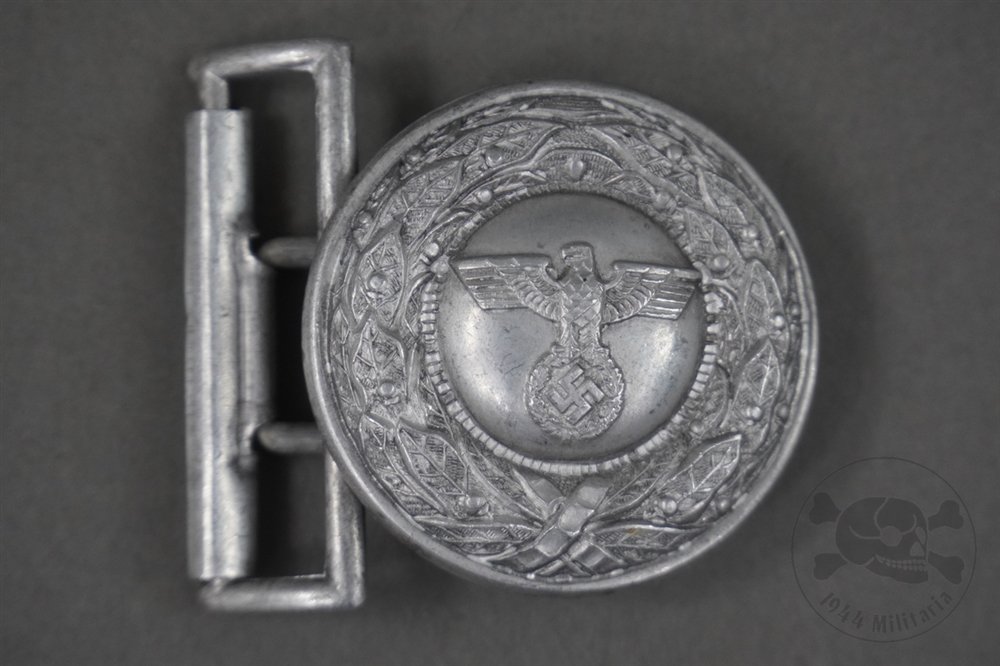 Original Third Reich State Justice Officials Buckle By Assmann & Dated 37-This original Justice Officials buckle from the Third Reich era represents a rare and exceptional find for collectors. Crafted by Assmann in 1937, the buckle features a striking aluminum construction with an unpainted, bare-metal finish—a hallmark of the period. Its design prominently showcases a German national eagle with a swastika emblem, set against a textured oval background and encircled by a wreath of finely detailed oak leaves.Despite its age, the buckle is in outstanding condition, with minimal signs of wear and a subtle patina that adds to its vintage appeal. The reverse side retains its complete original construction, including an integral hook for securing it to a belt catch, along with an aluminum loop and prongs for attachment to an officer-style belt. It is marked with an 'A' for Assmann, alongside the DRGM designation and the date, '37.'A scarce and sought-after piece, this Justice Officials buckle is presented in near mint condition, sure to appeal to dedicated collectors and enthusiasts.