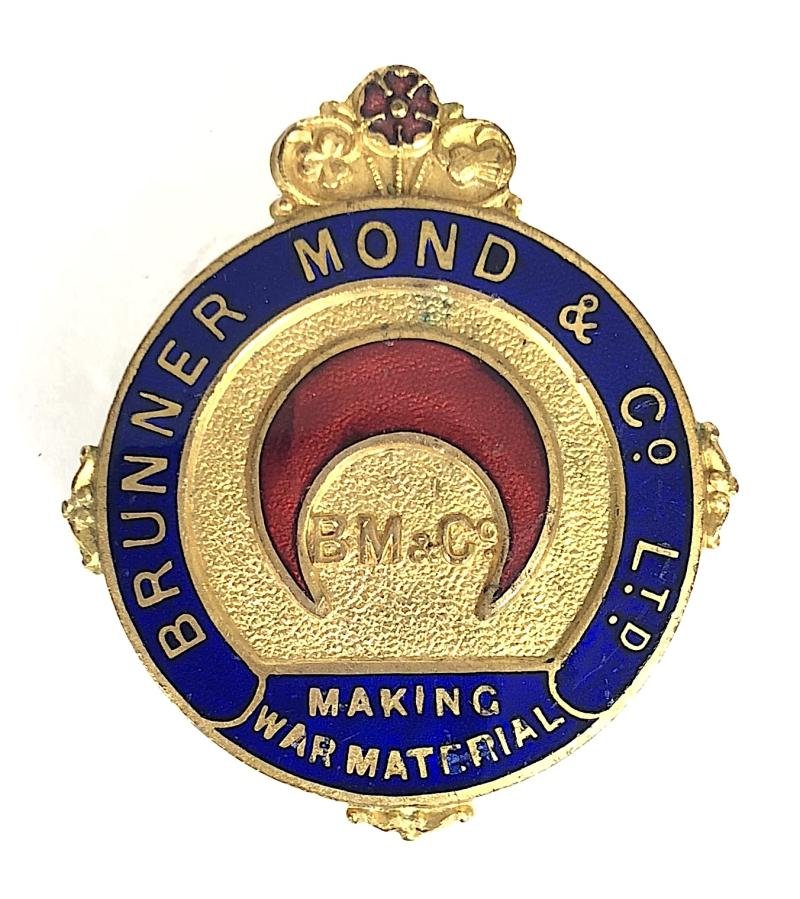 A scarce original early First World War period 'On War Service numbered identification badge'; large circular gilt brass example, the top surmounted by a Rose, Thistle and Shamrock the united emblems of England, Scotland and Ireland; the centre with red enamel crescent and initials 'BM&Co' within a blue enamel title surround 'Brunner Mond & Co Ltd Making War Material'; the reverse impressed with maker's details 'T. Fattorini Bolton' and 'Reg 638232' a registered, design and patent date of 1914 and complete with official issue number '2108'. Very good condition, complete with original buttonhole fitting, no damage to the enamel, gilt finish remains bright.Height 37mm.During the First World 'Brunner Mond & Co Ltd of Northwich, Cheshire made munitions for government use.