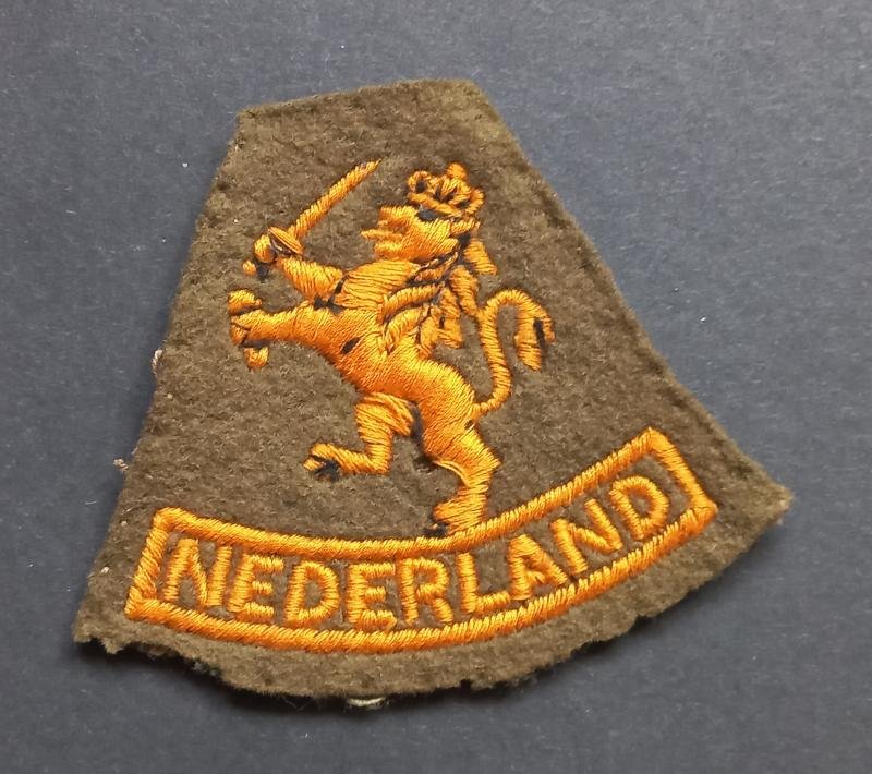 This is a neat example of a nice wartime British made Dutch Free Forces arm i.e formation lion. The lion was worn by all members of the Netherlands Army (Allied forces) what was later renamed as the Royal Netherlands Brigade. The Brigade was part of 21st Army Group and took part in the liberation of Western Europe and the Netherlands. The badge worn by all Netherlands troops on the left upper arm of their Battle Dress and when the Netherlands Army was re-formed the 'NEDERLAND' on the badge was replaced by 'JE MAINTIENDRAI', the motto of the House of Orange. This example is made of green felt and has a green cloth backing and is in a removed from uniform condition.